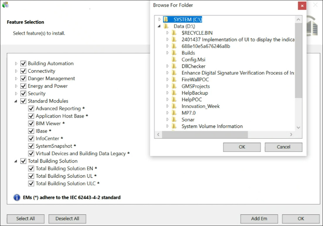 Wenn eine der obligatorischen Erweiterungen nicht IEC-zertifiziert ist, wird im Dialogfeld Feature Selection die Meldung "EMs (*) adhere to the IEC 62443-4-2 standard" angezeigt.