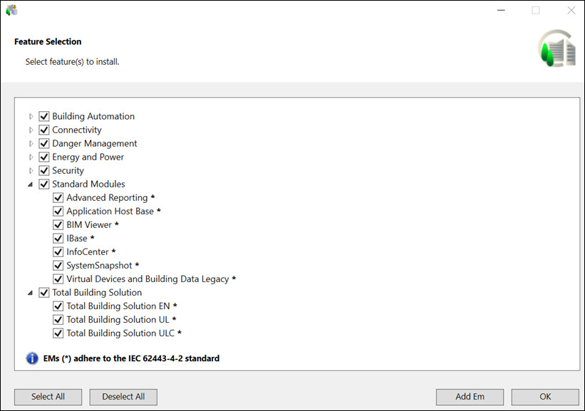 Wenn alle obligatorischen und nicht-obligatorischen Erweiterungen IEC-zertifiziert sind, wird im Dialogfeld " Feature Selection" die Meldung "Platform and EMs (*) adhere to the IEC 62443-4-2 standard" angezeigt.