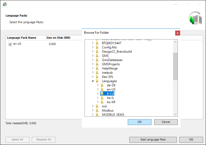 Der Speicherplatz wird um den Speicherbedarf der neu gewählten Erweiterung aktualisiert. Das Standard-Sprachpaket en-US wird während der Installation der Erweiterung installiert. Wenn Sie Erweiterungen hinzufügen, werden die im Ordner Languages verfügbaren Sprachpakete zusätzlich zum EM-Ordner für alle installierten Erweiterungen sowie für Desigo CC hinzugefügt.