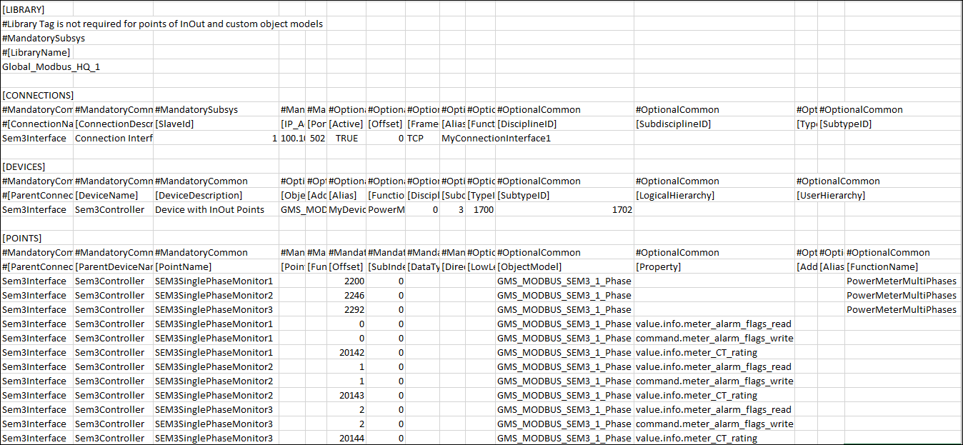 Zusätzlich müssen Sie alle relevanten Details in einer CSV-Datei angeben. Die Datei muss sorgfältig konfiguriert werden, um zu gewährleisten, dass die SEM3-Geräte in die Managementplattform integriert werden und dass jedes Embedded Micro Metering Modul unter dem SEM3-Regler im System Browser angezeigt wird. (Siehe SEM3-Geräte in das Managementsystem integrieren im Abschnitt Zusätzliche Modbus-Verfahren).