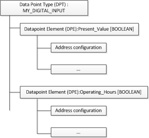 Der Datenobjekttyp wird Datenpunkttyp genannt. Ein Element innerhalb dieses Typs wird Eigenschaft genannt. (Dieses wird auch Datenpunkt-Element oder DPE genannt.) Für die Eigenschaft muss zudem eine entsprechende Adresse auf dem Feldgerät angegeben werden. Dies nennt man die Adresskonfiguration der Eigenschaft. Das Datenobjekt, bei dem es sich um eine Instanz des Datenpunkts handelt, wird Datenpunktinstanz (DPI) genannt.