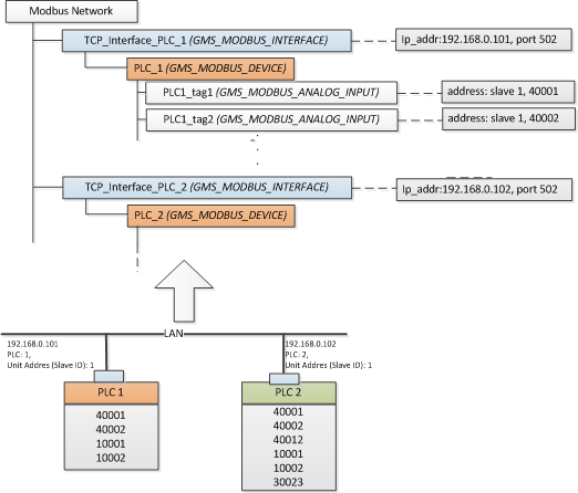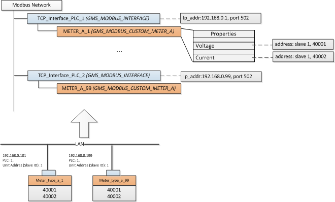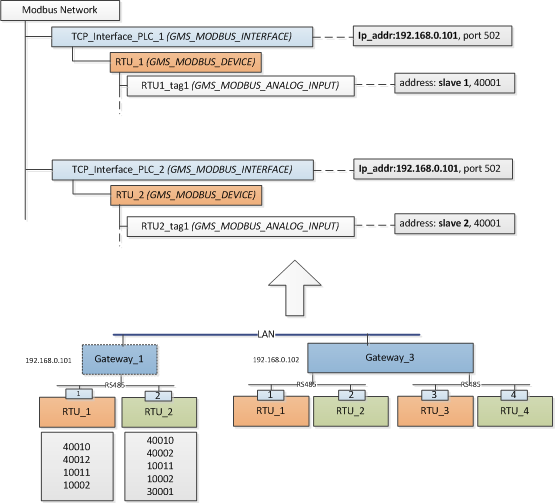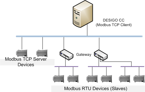 Jedes Modbus TCP-Gerät wird durch eine eindeutige Kombination von zwei Objekten dargestellt: die TCP-Schnittstelle und das Gerät. Dies kann kontra-intuitiv aussehen, da das Gerät und seine Kommunikationsschnittstelle physikalisch eine Einheit sind. Die logische Trennung zwischen Kommunikationsschnittstelle und Gerät ermöglicht jedoch, auch die Modbus-Geräte zu modellieren, die über ein Gateway-Gerät integriert sind. In diesem Fall hat nicht jedes Modbus-Gerät eine physikalische TCP-Schnittstelle. Der Modbus-Client sendet die Anforderung zusammen mit der Slave-Adresse des Modbus RS485-Gerätes an die IP-Adresse des Gateways. Das Gateway verwendet dann das klassische Modbus-Protokoll, um das Slave-Gerät abzufragen, nimmt die Antwort entgegen und leitet sie als Modbus TCP-Antwort an den Modbus-Client weiter.