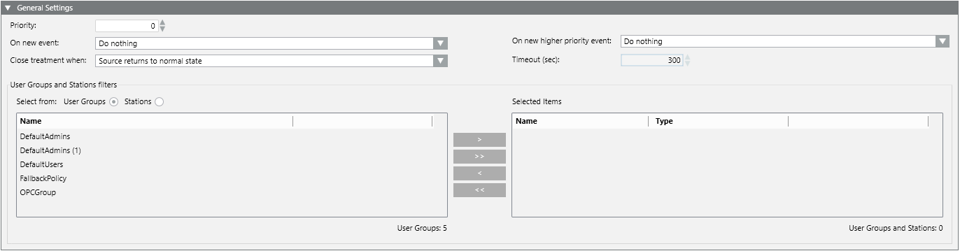 - Wählen Sie das Optionsfeld Benutzergruppen oder Stationen, um eine Liste der entsprechenden Elemente in der Liste unten links anzuzeigen. Verschieben Sie dann Elemente in die Liste Ausgewählte Elemente oder umgekehrt, indem Sie auf sie doppelklicken oder die Pfeiltasten verwenden.