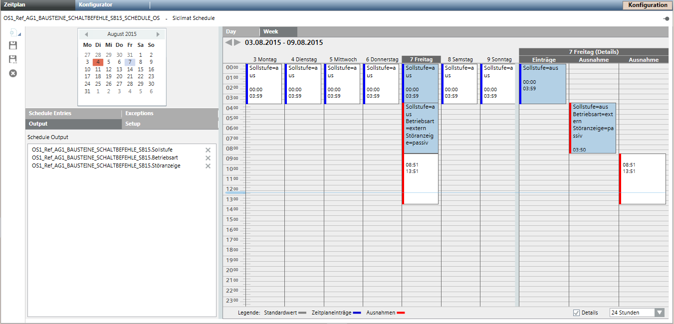 Mit der Zeitplanungsfunktion können Sie tägliche oder wöchentliche Pläne für Ihre SICLIMAT X-Objekte erstellen, wobei die Managementstation mehrere Kalender oder Zeitpläne gleichzeitig ausführen kann. Sie können auch Ausnahmen von Zeitplänen angeben. Wenn eine Ausnahme aktiv ist, wird damit der Wochenzeitplan übersteuert. Ist die Ausnahme inaktiv, übernimmt der Wochenzeitplan wieder die Steuerung.