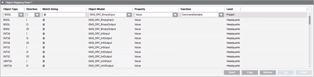 - Wenn für ein OPC-Item der Objekttyp und die Richtung in der Regel definiert ist und die Adresse der Zeichenfolge in Mit Zeichenfolge übereinstimmen entspricht, dann wirddieses OPC-Item unter Verwendung des ausgewählten Objektmodells importiert und der ausgewählten Eigenschaft zugeordnet.