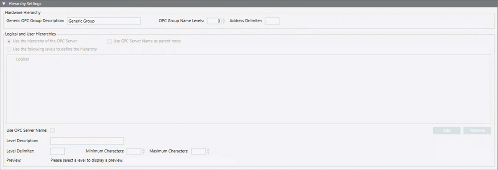 Geben Sie für die (physikalische) Hardware-Hierarchie, die in die Managementsicht importiert wird, den Namen der generischen OPC-Gruppe, die Anzahl der Ebenen in der Adresse der OPC-Items, aus der der OPC-Gruppenname generiert wird, und die Trennzeichen an.