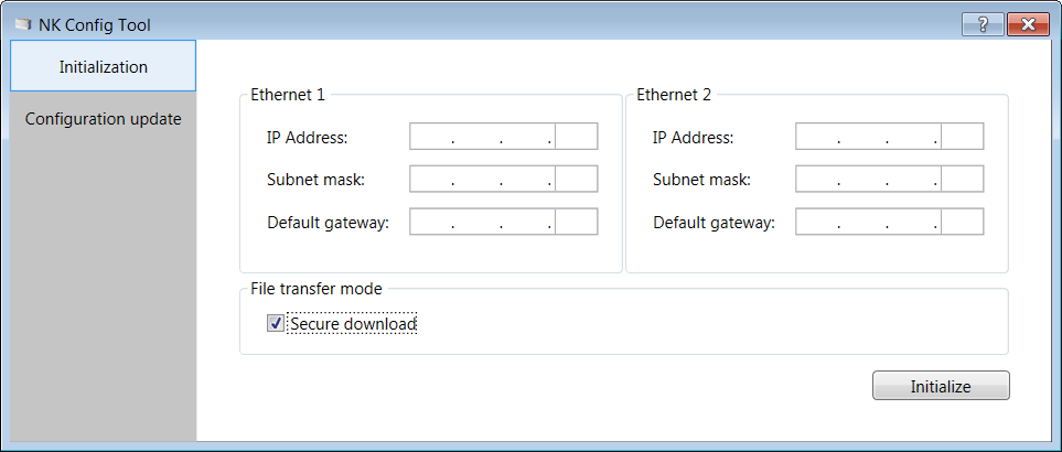 - Das Kontrollkästchen Dateitransfer-Modus ist standardmässig auf Sicherer Download eingestellt (verschlüsselte Datenübertragung über TCP-Port 20500). Wenn Sie eine lokale und sichere Verbindung zum NK823x-Gerät haben, können Sie das Kontrollkästchen deaktivieren und einen schnelleren passiven FTP-Modus anwenden.