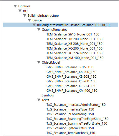 Durch das Erweiterungsmodul Scalance wird die Desigo CC Bibliothek BuildingInfrastructure_Device_Scalance_150_HQ_1 installiert, die in folgendem Pfad verfügbar ist: Bibliotheken > L1-Headquarter > Gebäudeinfrastruktur > Gerät.