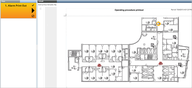 Sie haben das Fenster Geführte Alarmbearbeitung geöffnet und der Massnahmenkatalog enthält eine Massnahme Alarmausdruck, die Sie manuell ausführen müssen.