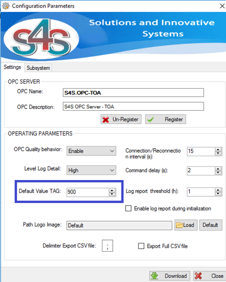 Da Desigo CC negative Werte für die entsprechenden Text-Status nicht enumerieren kann, ist es im S4S-OPC-Server notwendig, den Tag-Standardwert auf 900 zu ändern (in folgender Abbildung markiert). Die Option zur Änderung des Werts ist im Menü Konfigurationsparameter des S4S-OPC-Servers TOA enthalten.