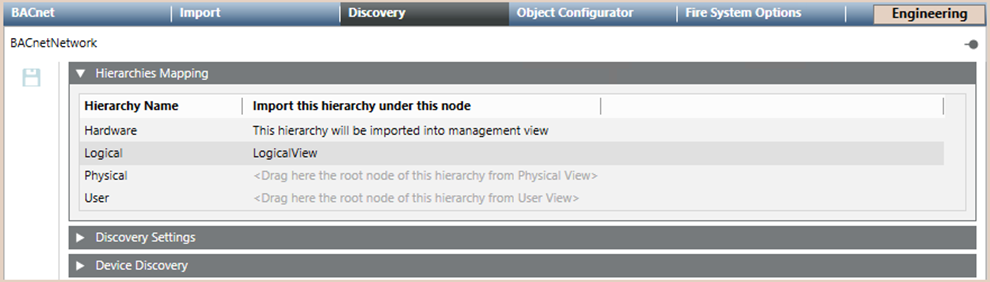 - Importieren Sie das Gerät mit der BACnet AutoDiscovery-Funktion. Anleitungen zur Integration von BACnet-Drittgeräten finden Sie unter Workflow Online-Engineering.