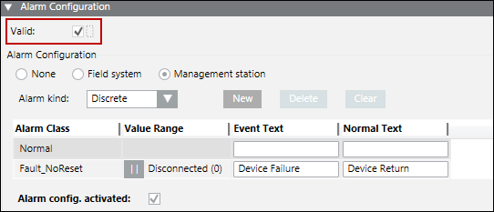 - Entfernen Sie im Expander Alarmkonfiguration die Markierung im Kästchen bei Gültig, um Ihre eigene Alarmklasse zu konfigurieren und den manuellen Eingriff zu vermeiden.