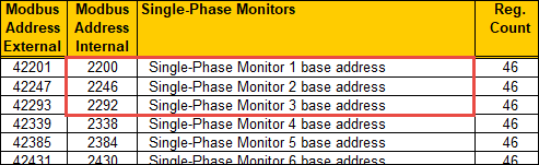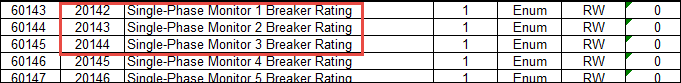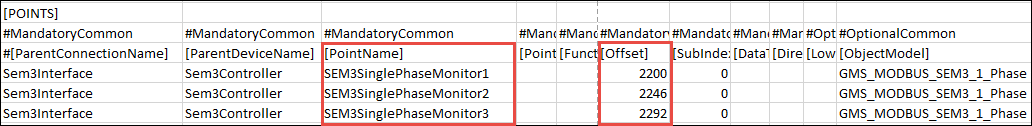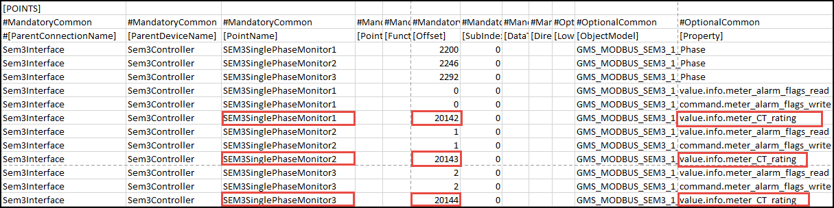 - Wenn Sie den Offset für die CT-Bewertung für jedes EMMM konfigurieren möchten, müssen Sie die interne Adresse für jedes EMMM als Offset-Wert für die Eigenschaft value.info.meter_CT_rating für jede EMMM in der CSV-Datei nennen. Wenn Sie beispielsweise die CT-Bewertung für 3 EMMMs (Einphasenmonitor 1, SEM3 Einphasenmonitor 2 und SEM3 Einphasenmonitor 3) konfigurieren möchten, müssen Sie die interne Adresse des EMMMs aus dem Gerätehandbuch (20142, 20143 und 2144) als Offset-Wert für die Eigenschaft value.info.meter_CT_rating in der CSV-Datei nennen.