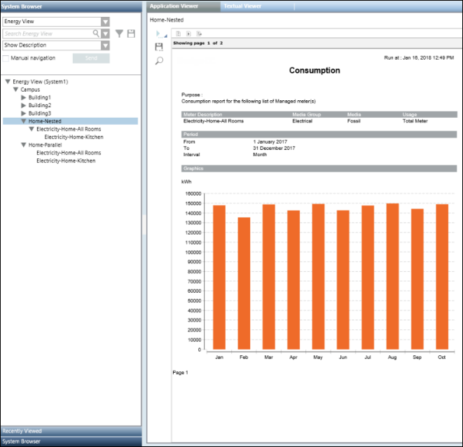 Wenn ein Aggregator-Knoten verschachtelte verwaltete Zähler enthält, zeigt der Bericht die Daten der verwalteten Zähler der ersten Ebene (übergeordnete Zähler) an, wenn der Bericht durch Auswahl des Aggregator-Knotens ausgeführt wurde. Im folgenden Beispiel ist Elektrizität-Zuhause-Küche ein verschachtelter Zähler und Elektrizität-Zuhause-Alle Räume ein Zähler der ersten Ebene.