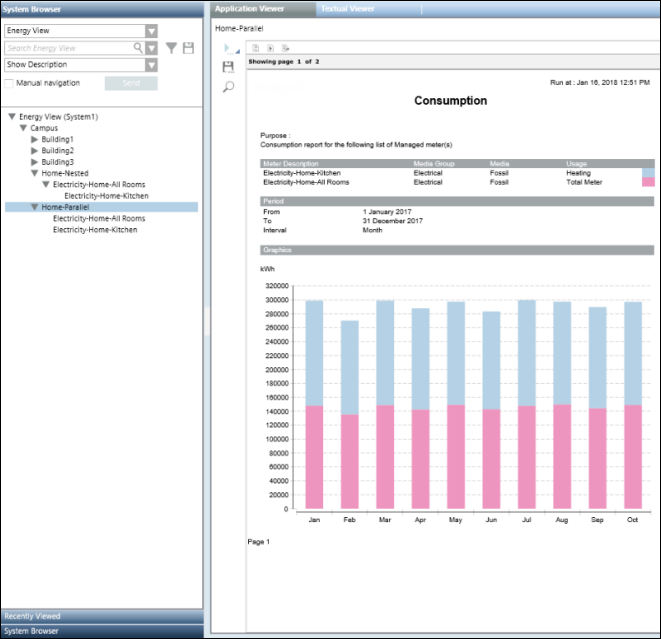Wenn Sie einen Bericht durch Auswahl des Aggregator-Knotens Zuhause-Parallel ausführen, werden die Daten für beide Zähler, Elektrizität-Zuhause-Alle Räume und Elektrizität-Zuhause-Küche angezeigt.