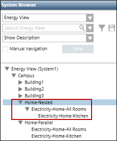 Im obigen Beispiel berechnet der Zähler Elektrizität-Zuhause-Küche den Verbrauch der Küche, während der Zähler Elektrizität-Zuhause-Alle Räume den Verbrauch des gesamten Hauses inklusive der Küche berechnet. Wenn diese beiden Zähler parallel nebeneinander gesetzt werden und der Bericht durch Auswahl des Knotens Zuhause-Parallel ausgeführt wird, wird der Verbrauch der Küche von beiden Zählern berechnet, was nicht richtig ist. Daher muss der Zähler Elektrizität-Zuhause-Küche unter dem Zähler Elektrizität-Zuhause-Alle Räume angeordnet sein, um sicherzustellen, dass sein Verbrauch nicht doppelt gerechnet wird. Um nur den Verbrauch der Küche zu berechnen, müssen Sie den Bericht durch Auswahl des Zählers Elektrizität-Zuhause-Küche im Aggregator-Knoten Zuhause-Verschachtelt ausführen.