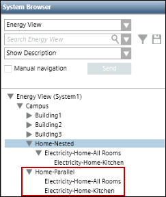 Im folgenden Beispiel stehen die Zähler Elektrizität-Zuhause-Alle Räume und Elektrizität-Zuhause-Küche parallel nebeneinander im Aggregator-Knoten Zuhause-Parallel.