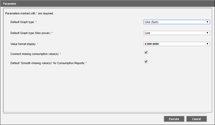 Zum Verbinden und Glätten dieser fehlenden Werte verwenden Sie das Kontrollkästchen Fehlende Verbrauchswerte verbinden im Dialogfeld Parameter. Dieses öffnen Sie, indem Sie neben Energieberichte die Option Bearbeiten klicken. Die Einstellungen auf der Konfigurationsseite und im Kontrollkästchen Fehlende Werte glätten des Dialogfelds Parameter werden beim Ausführen des Verbrauchsberichts aufgerufen. Weitere Informationen zum Ausführen eines Berichts finden Sie unter Energieberichte ausführen.