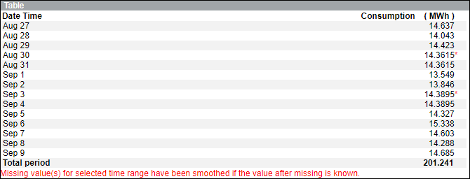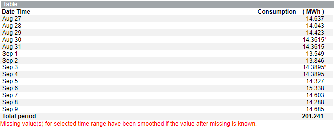 - Zeigt eine Meldung, dass die fehlenden Werte für den ausgewählten Zeitbereich geglättet wurden, wenn der darauf folgende Wert bekannt ist.