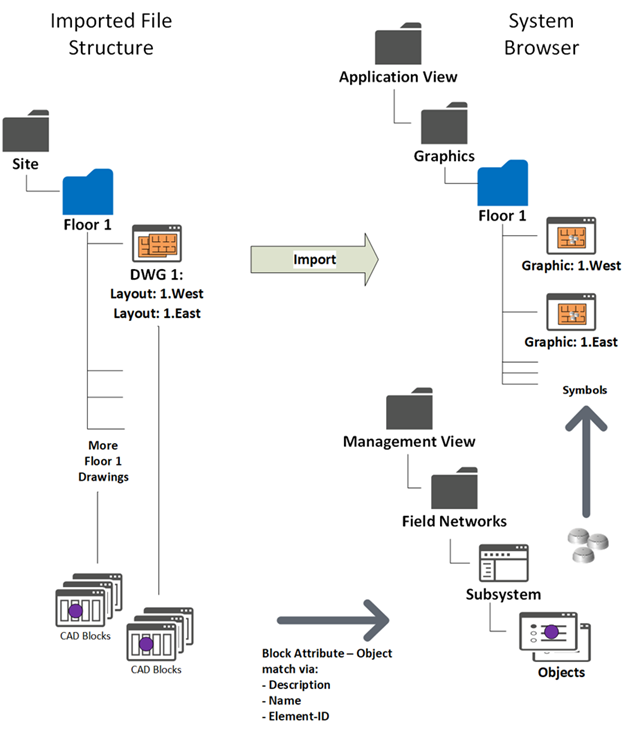 - Das Tool erstellt eine Desigo CC Grafik pro gewähltem Layout und enthält die Symbole für die identifizierten CAD-Objekte. Ein Anwendungsbeispiel finden Sie unter Advanced CAD Importer – Beispiel für FS20.