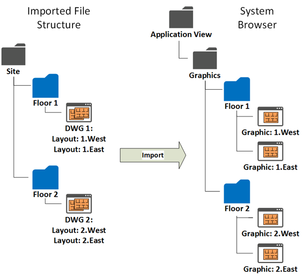 Durch das Importverfahren wird die Unterordnerstruktur unter dem Desigo CC Grafik-Ordner der Applikationsansicht repliziert, und es werden neue Desigo CC Grafiken erstellt, die die Zeichnungen als Hintergrund enthalten.