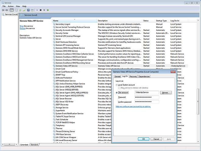 Das Konto Video-API-Dienst muss in Windows über das Recht Als Dienst anmelden verfügen. Gehen Sie wie folgt vor, um dies zu überprüfen oder zu konfigurieren: