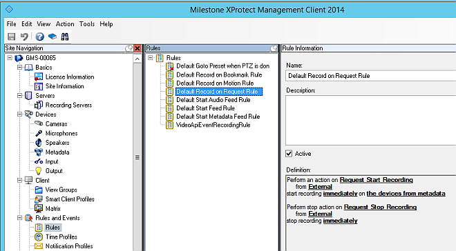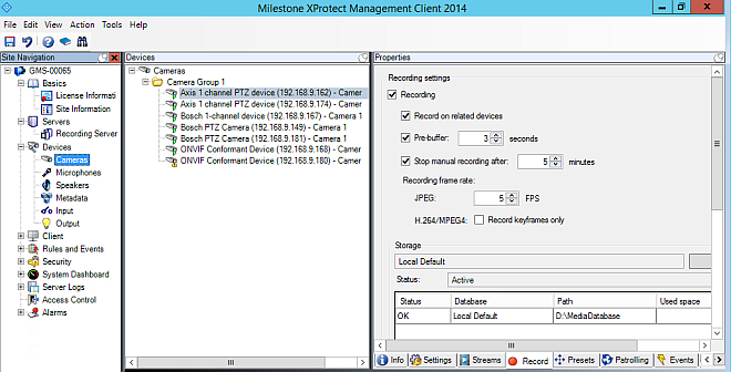 Sie müssen die Kameraaufzeichnungsoption auf der Seite Eigenschaften im VMS-Management-Client aktivieren, um Aufzeichnungen zu machen. Der Status der Aktivierung wird von der Video-API gemeldet und auf der Systemkonfigurationsseite angezeigt.