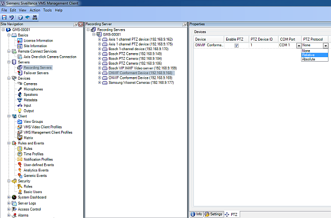Wenn Kameras über den ONVIF-Treiber mit dem VMS verknüpft sind, benötigen Sie eine zusätzliche Konfigurationsmassnahme, um die PTZ-Fähigkeiten der Kamera nutzen zu können. Gehen Sie wie folgt vor:
