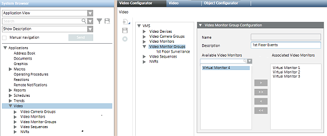 - Die neue Monitorgruppe wird dem Ordner Videomonitorgruppen der VMS-Struktur und unter Applikationen > Video > Monitorgruppen im System Browser hinzugefügt.