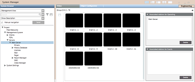 Um Video anzeigen zu können, muss eine Managementstation über eine zugewiesene Monitorgruppe für den Normalbetrieb verfügen, die im Video-Display der Managementstation angezeigt wird. Zusätzlich muss ein Bedienplatz über eine zugewiesene Monitorgruppe für Alarme verfügen, um während der Alarmbearbeitung Video anzeigen zu können. Der Desigo CC-Server-Bedienplatz verfügt standardmässig über zwei vorkonfigurierte Monitorgruppen, die ihm zugewiesen sind. Alle weiteren Bedienplätze müssen manuell einer Monitorgruppe zugewiesen werden, bevor sie Video anzeigen können.