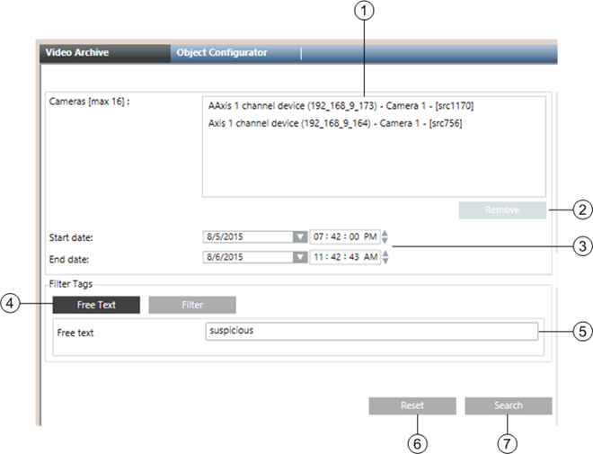 1 | Kameras | Sie können bis zu 16 Kameras, deren Aufzeichnungen in die Suche einbezogen werden, ziehen und ablegen. |