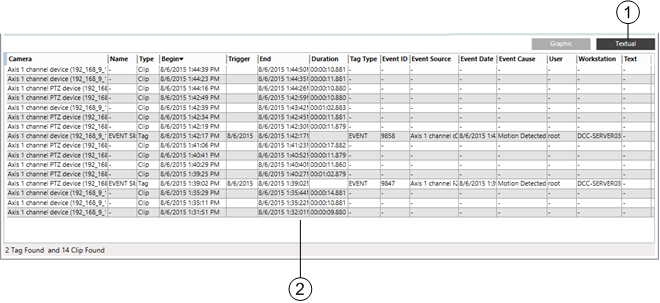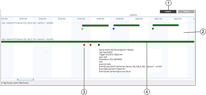 Die Ergebnisse der Suche werden im Abschnitt Timeline am unteren Rand des Registers Videoarchiv angezeigt. Die Timeline zeigt Aufzeichnungen und Marker, die zur Abfragedefinition passen. Wie bei der Timeline im Kontextbereich können Sie auch hier wählen, ob die Abfrageergebnisse grafisch oder als Text dargestellt werden sollen.