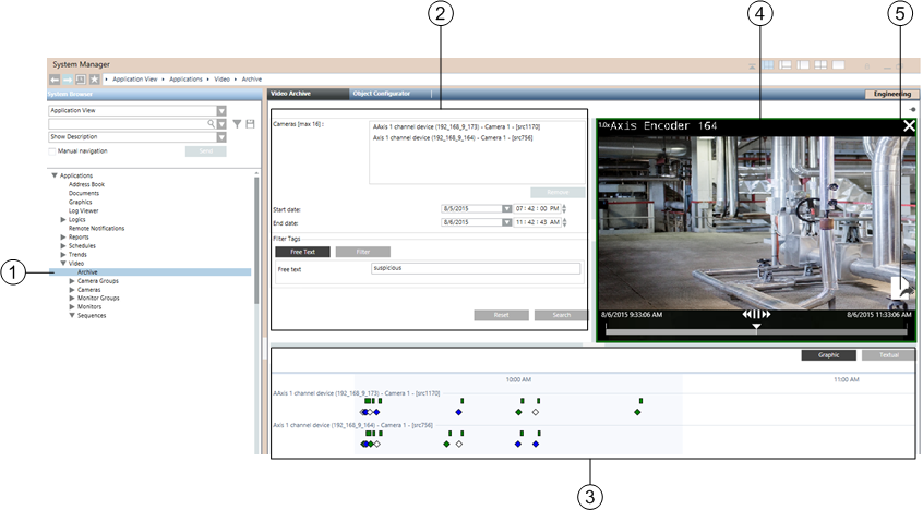 Wenn Sie im System Browser Video >Archiv wählen, gelangen Sie zum Register Videoarchiv, in dem Sie Abfragen ausführen und nach Aufzeichnungen suchen können. Ausführliche Anweisungen finden Sie unter Aufzeichnungen im Videoarchiv suchen