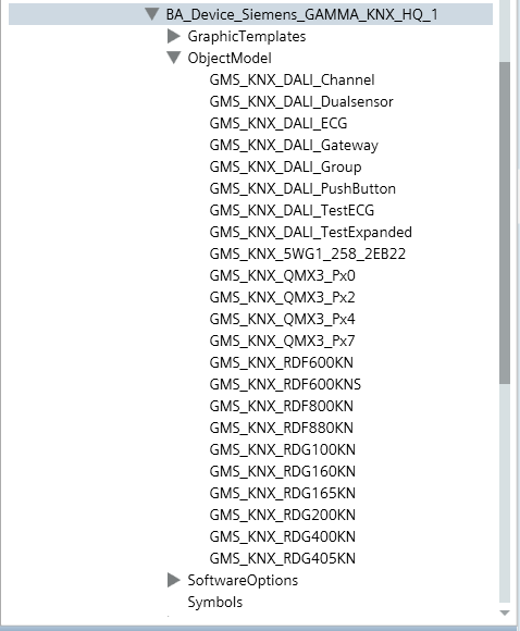 Die Erweiterung Siemens GAMMA KNX installiert die Desigo CC Bibliothek BA_Device_Siemens_GAMMA_KNX_HQ_1, die unter Projekt > Systemeinstellungen > Bibliotheken > L1-Headquarter > BA > Gerät verfügbar ist.