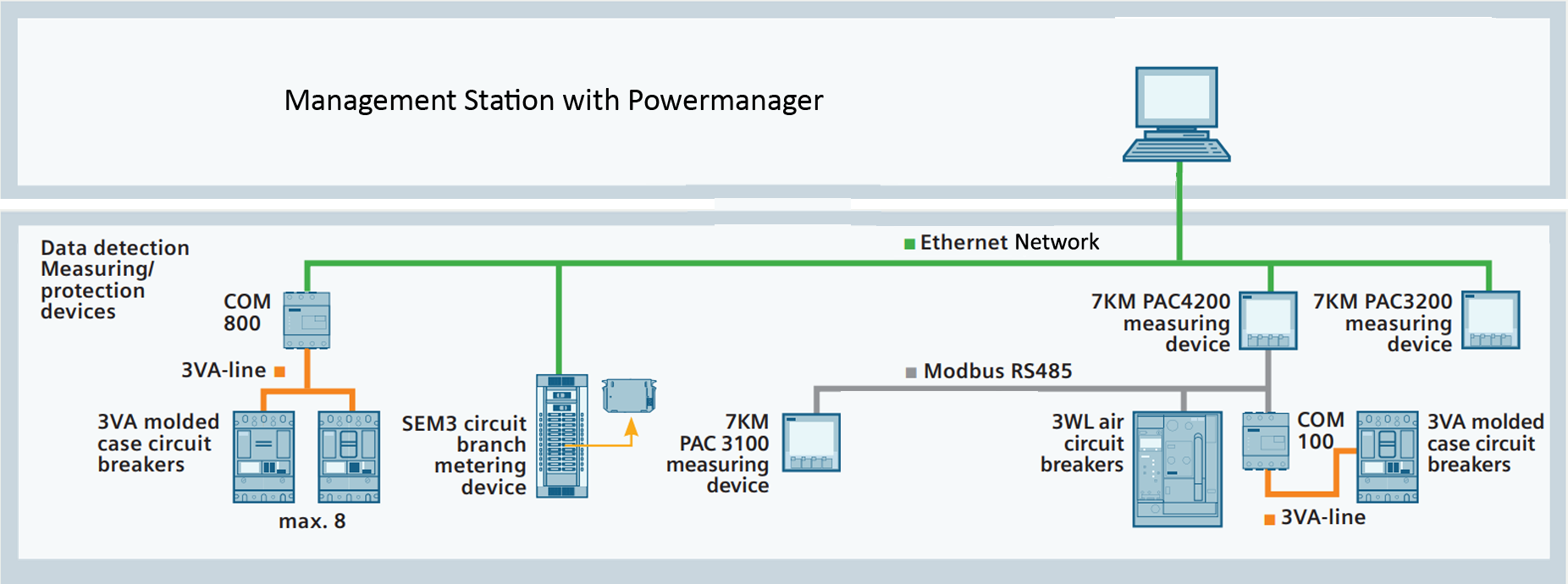 Die Applikation gewährleistet eine nahtlose Integration der Multifunktionsmessgeräte der Siemens PAC-Serie, der Leistungsschalter SEM3 und 3VA/3WL/3VL sowie anderer Modbus-Kommunikationsgeräten. Er sammelt, archiviert, überwacht und zeigt alle Arten energierelevanter Gerätedaten an und wertet diese aus.