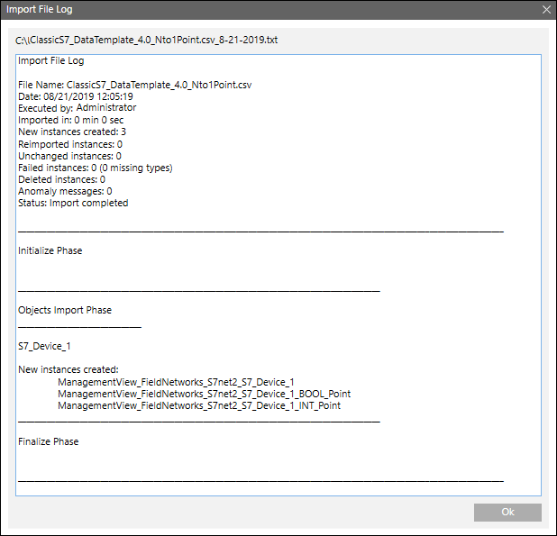 Dieser Vorgang veranlasst auch die Hierarchie der Managementsicht, Objekte und interne Ordner (Punkte) hinzuzufügen und interne Objekte zu entfernen. Durch den Importvorgang werden alle S7-Geräte gelöscht, die in der CSV-Datei nicht mehr vorhanden sind (nur wenn das Kontrollkästchen Nicht selektierte Objekte löschen aktiviert ist).