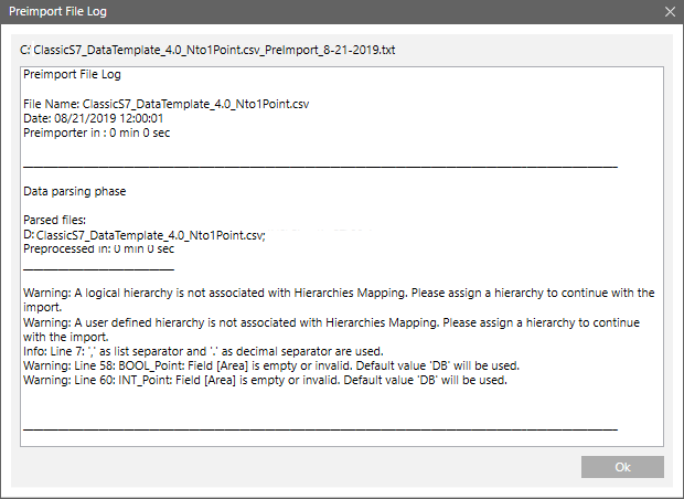 Sie können die während der Vorverarbeitung der CSV-Datei aufgetretenen Fehler im Dialogfeld Prä-Import-Logdatei anzeigen, indem Sie die Schaltfläche Analyse-Log klicken, die über dem Feld Zu importierende Objekte verfügbar ist. Die Schaltfläche Analyse-Log wird erst aktiviert, wenn die Vorverarbeitung abgeschlossen wurde.