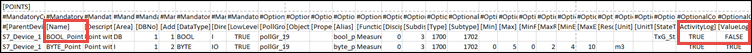 Bei Aufzählungen und booleschen Datentypen müssen normalerweise anstelle der Rohwerte bestimmte Texte angezeigt werden. So kann beispielsweise die 0/1 eines booleschen Datentyps als Start/Stopp dargestellt werden. Dies erreichen Sie, indem Sie den Namen der Textgruppe in das Feld StateText eingeben. Das Attribut StateText in einer CSV-Datei für einen Booleschen Punkt kann wie folgt konfiguriert werden: