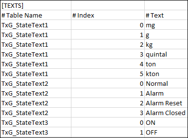 - Im Falle von Einheiten erstellt der Konverter im Abschnitt [TEXTS] eine Textgruppe, deren Name mit TxG_PRJ_S7 anstelle von TxG_S7_PRJ beginnt. Bezogen auf das vorherige Beispiel ist der Name der Textgruppe immer TxG_S7_PRJ _Units und die Einträge lauten wie folgt: