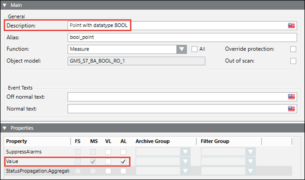 - Für binäre (boolesche) Punkte kann nur ein Alarm angegeben werden.