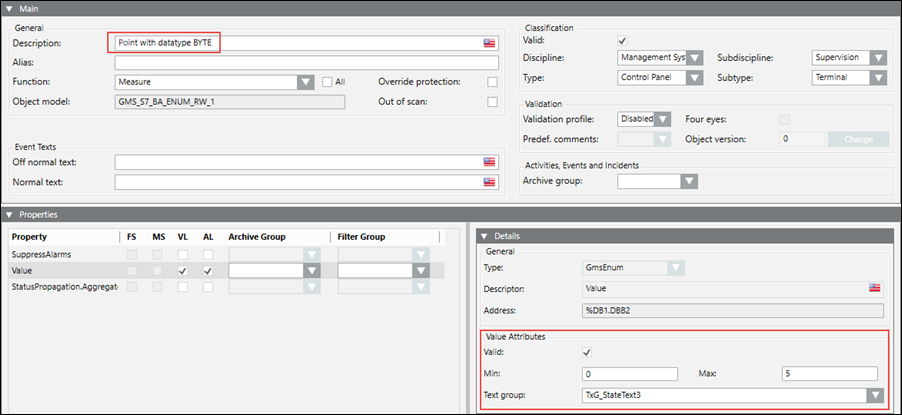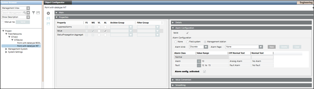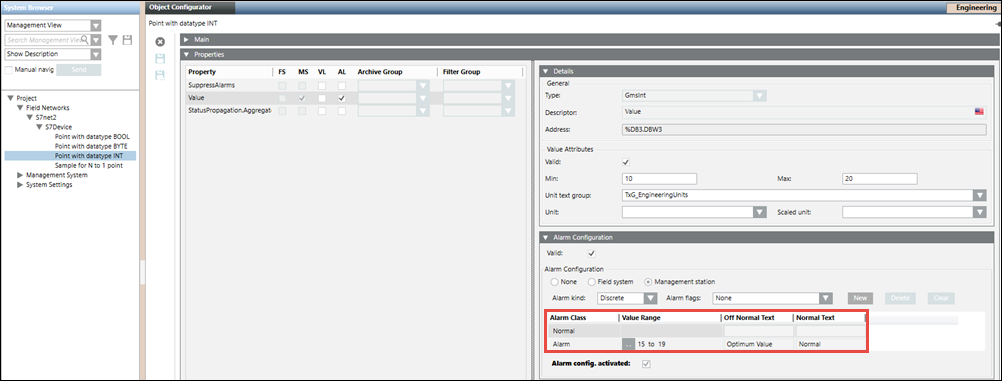 - AlarmValue: Der Wert oder Wertebereich, für den ein Alarm ausgegeben wird.