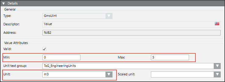 Die Felder für Min, Max und Einheit können für Werte der Typen INT, UINT und REAL gesetzt werden.