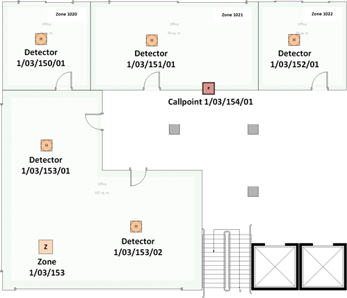 - 1/03/154/01 - Eine Brandmeldezone (1/03/153), übergeordnetes Objekt von zwei Meldern:
