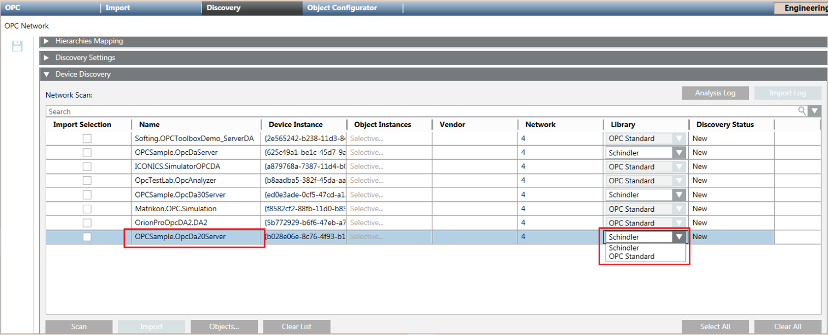 - Wenn OPC-Server erkannt werden, werden sie im Abschnitt Netzwerksuche angezeigt. Im Expander Geräteerkennung enthält die Spalte Bibliothek für den Server OPCSample.OpcDa20Server.1 die Bibliothek Schindler.