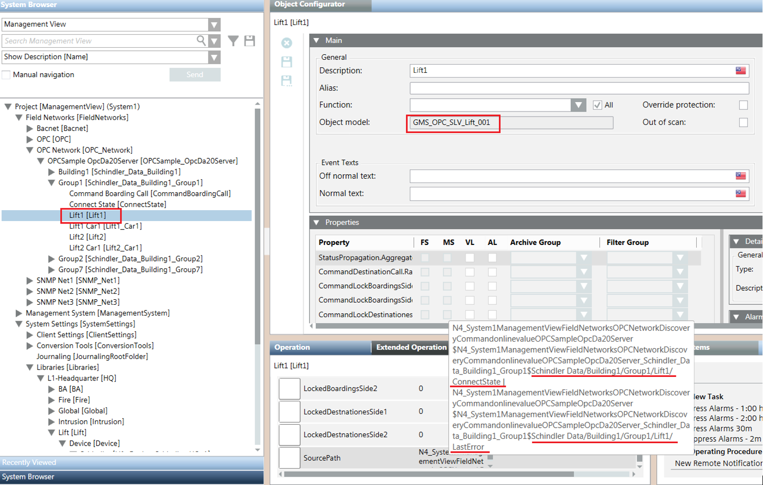 - Entsprechend den Bibliothekserkennungsregeln werden die in der obigen Abbildung hervorgehobenen OPC-Items den verschiedenen Eigenschaften des Knotens "Lift1" vom Typ GMS_OPC_SLV_Lift_001 zugeordnet (siehe Eigenschaft