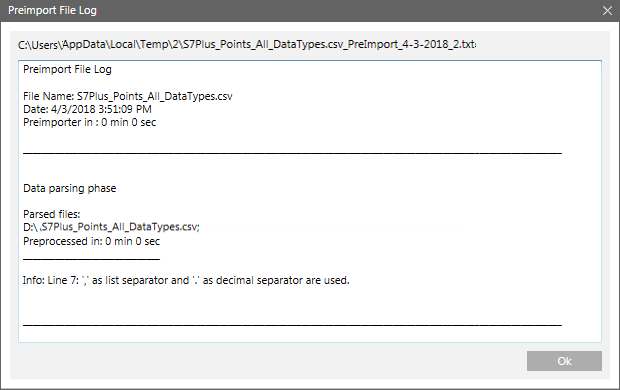 Sie können die während der Vorverarbeitung der CSV-Datei aufgetretenen Fehler im Dialogfeld Prä-Import-Logdatei anzeigen, indem Sie die Schaltfläche Analyse-Log klicken, die über dem Feld Zu importierende Objekte verfügbar ist. Die Schaltfläche Analyse-Log wird erst aktiviert, wenn die Vorverarbeitung abgeschlossen wurde.