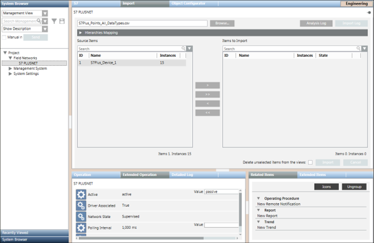 Hinweis: Wenn Sie S7 PLUS-Geräteverbindungen oder logische Geräte importieren möchten, lässt das System dies nur zu, wenn die Eigenschaft Systemobjektlimit und Meldungsschwelle die jeweils definierten Grenzen damit nicht überschreiten.