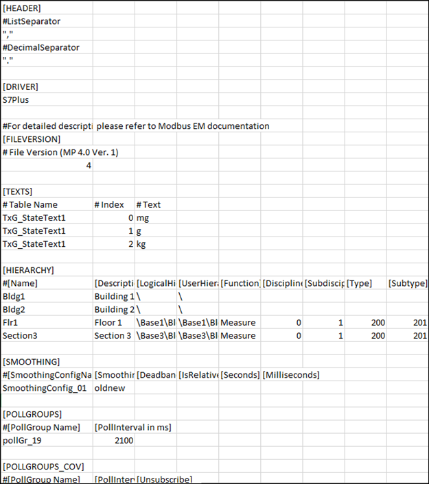 Um Instanzen der S7 PLUS Geräte zu erstellen, müssen Sie eine CSV-Datei (Comma-Separated Values, kommagetrennte Werte) mit den Konfigurationsdaten anlegen. Eine CSV-Datei enthält Daten, in denen Werte als Text dargestellt und mit einem Komma (,) als Trennzeichen getrennt werden. Die Datei im CSV-Format kann in einem Texteditor wie Wordpad oder Notepad bearbeitet werden. Eine umfangreichere Bearbeitung kann in einem höher entwickelten Tabellenkalkulationsprogramm, z.B. in Excel, durchgeführt werden. Eine CSV-Datei ist in folgende Abschnitte aufgeteilt.