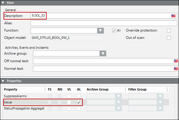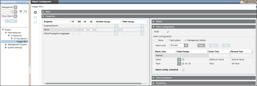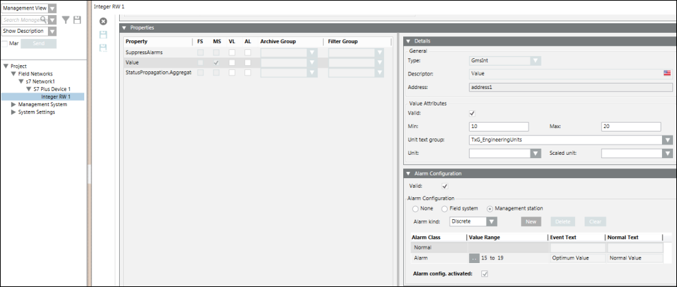 - AlarmValue: Der Wert oder Wertebereich, für den ein Alarm ausgegeben wird.