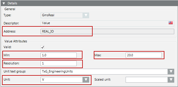 UnitTextGroup | Name der Textgruppe, in der der Einheitentext aus dem Feld Einheit definiert ist. Wenn die Textgruppe für die Einheit leer ist, wird der Standardwert "TxG_EngineeringUnits" verwendet. |